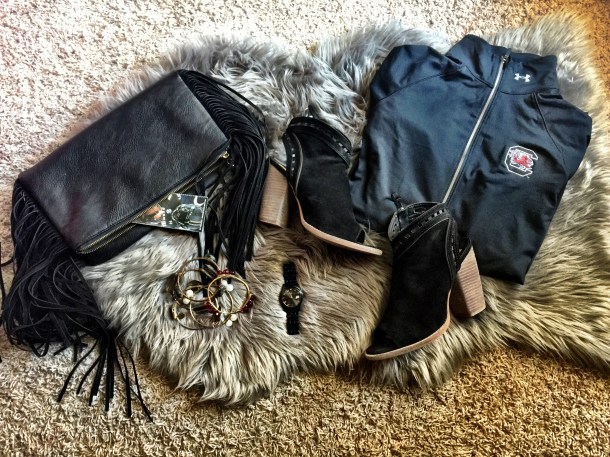 With USC’s new clear bag policy I decided to carry a bag that I could fold , this one from Entourage. However, if you’re looking for a clear bag Miss Cocky has a huge selection to choose from! The booties are by Dolce Vita , but, they were actually purchased from Shoes on King in Charleston, SC. They’re seriously the comfiest heels! I usually pair these essentials with a LBD and I normally wear the Under Armour pullover with a pair of leggings while I’m lounging before the game, preparing brunch, or running some last minute errands prior to the game.